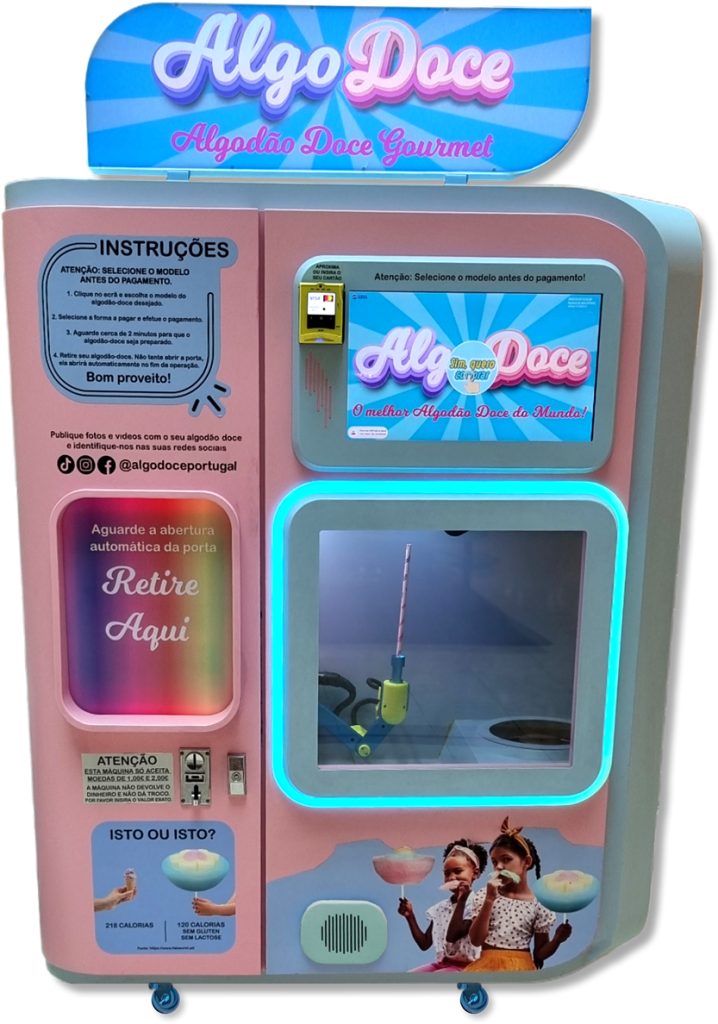 A primeira máquina robô de algodão-doce de Portugal 100% automatizada, dispensa a necessidade de um operador e com manutenção simples e rápida.